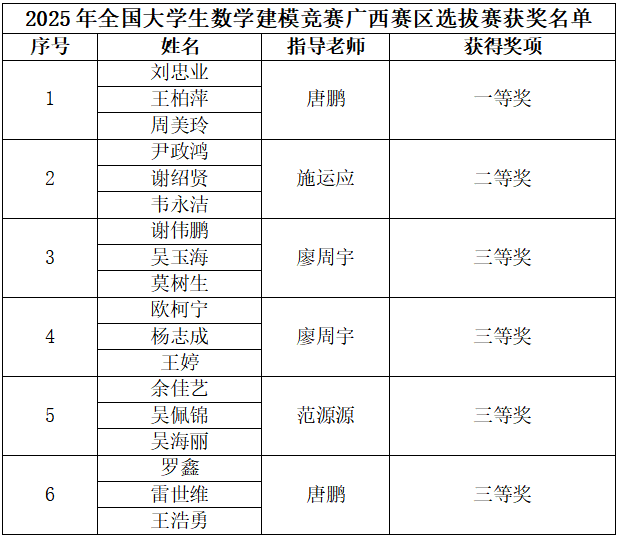 近日,2025年全国大学生数学建模竞赛广西赛区选拔赛获奖名单公示结束。在全区53所高校、1611支队伍的激烈角逐中,我校大数据与计算机学院学子凭借计算机赋能建模学科优势脱颖而出,最终斩获一等奖1项、二等奖1项、三等奖4项。