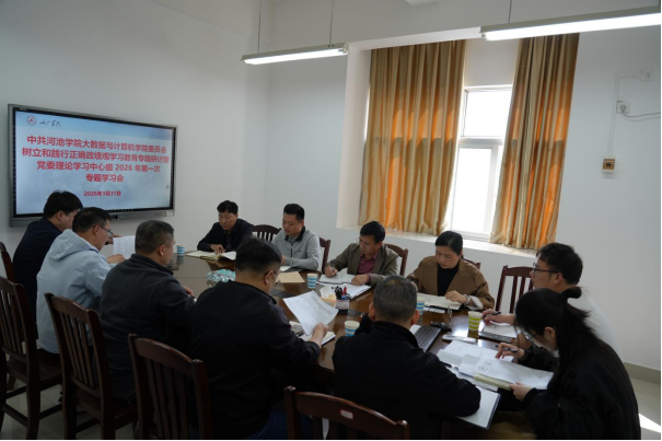 3月31日下午,河池学院大数据与计算机学院在逸夫楼B504会议室召开树立和践行正确政绩观学习教育专题研讨会暨党委理论学习中心组2026年第一次专题学习会。学院党委书记钟友坤主持会议并讲话,学院领导班子成员、党委理论学习中心组成员出席会议,各党支部书记、专职组织员、各教研室(实验中心)主任、办公室主任及团委书记列席会议。